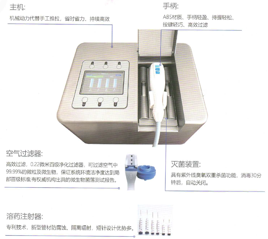 2提高護士的工作效率:獨立上下鍵操控,省時省力;氣源驅動,溶液沖擊力大,可加速難溶藥物的溶解,做到快速配藥。